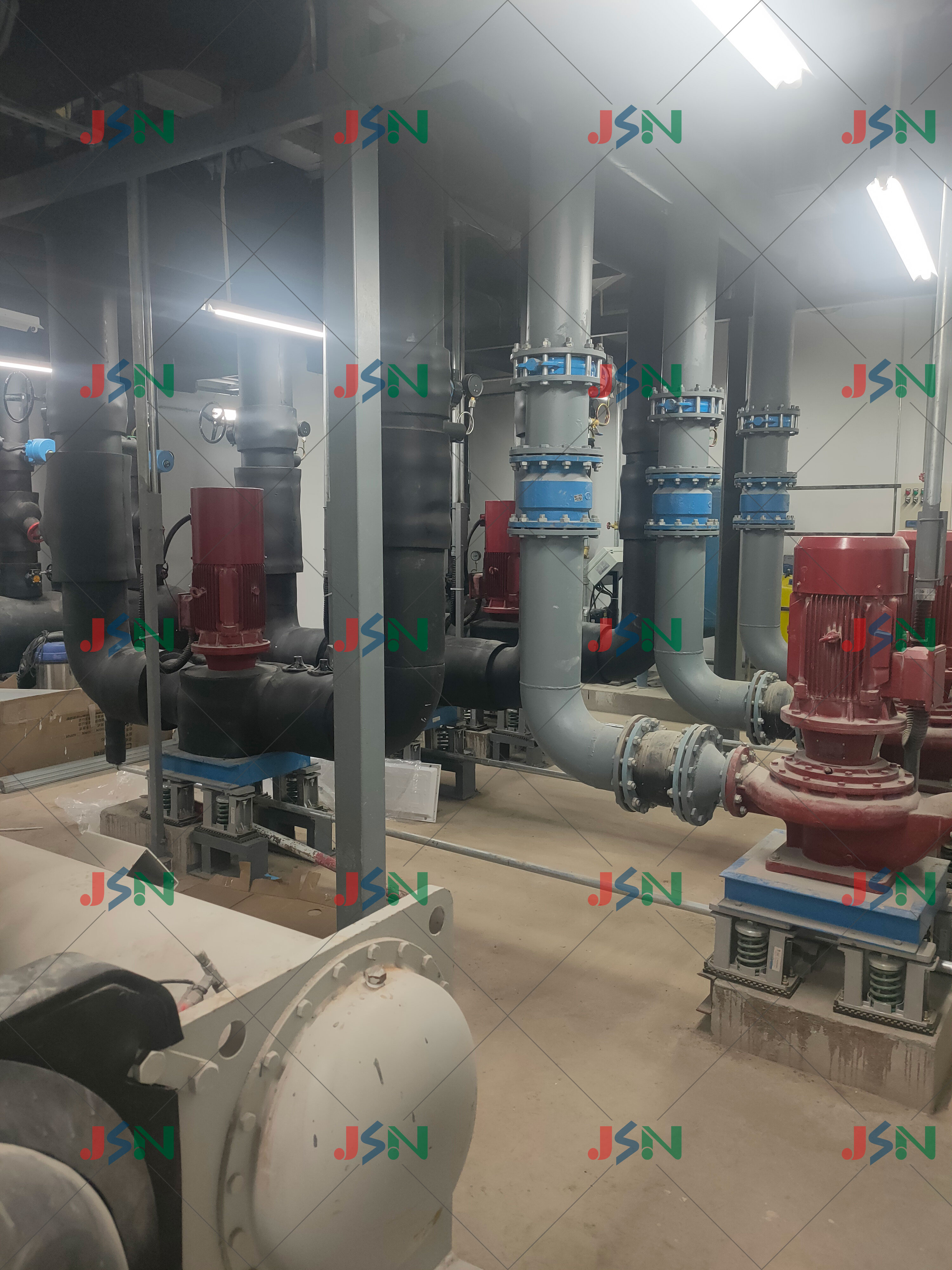 水泵配套金諾混合型減震臺座及JAD型撓度50mm可調式鋁合金減振器,水泵及管道之間安裝了XGD1型可曲撓單球體橡膠軟接頭,主機也是選用JAD型大撓度可調式彈簧減振器,目前在技術人員的指導下,產品已經全部安裝完畢,減震效果極佳,得到了業(yè)主和施工單位的一致好評。