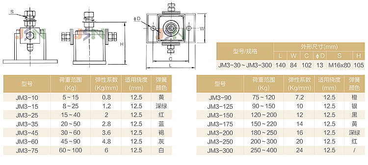 JM3防剪切彈簧減振器,減振器兩側設計固定螺栓運輸前鎖死能有效的防止機組運輸過程中出現(xiàn)搖晃產(chǎn)生連接損壞,它在運輸過程具有好固定方式,外形美觀大方等特點,可調(diào)節(jié)自由高度,能保證機組達到水平狀態(tài)。適用于空氣交換設備、空氣壓縮機、風機、暖通空調(diào)設備。