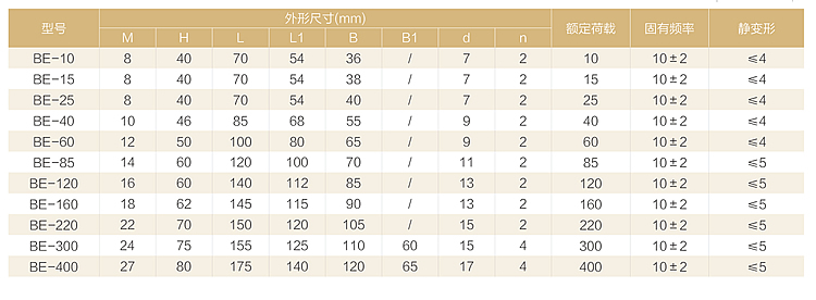 BE型橡膠減振器的固有頻率低,阻尼比適宜,橫向剛度高于垂向剛度;適用于平置,倒置及側(cè)掛等多種安裝形式,平置使用時(shí),橫向穩(wěn)定性好。當(dāng)承受較大沖擊時(shí),可自動(dòng)限位保護(hù),同時(shí)對(duì)共振峰的仰制能力很強(qiáng),對(duì)瞬態(tài)沖擊響應(yīng)、瞬時(shí)過度工況等引起的自振能迅速消失,設(shè)備不致出現(xiàn)任何晃動(dòng),該產(chǎn)品在較寬的干擾頻率范圍內(nèi)有相當(dāng)明顯的隔振效果。對(duì)有水平擾力的機(jī)械設(shè)備,使用本隔振器能取得良好的隔振效果。