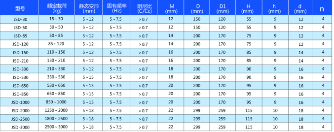 JSD型橡膠減振器是由國內(nèi),外鋼套和中間的合成橡膠組成,經(jīng)硫化呈中空圓錐體,橡膠部分受剪切力,具有較大的變形范圍和較低的固有頻率,工作溫度范圍-5℃~+50℃.適用水泵,壓縮機,通風機,冷凍機等機械設(shè)備,都有良好的減振效果。