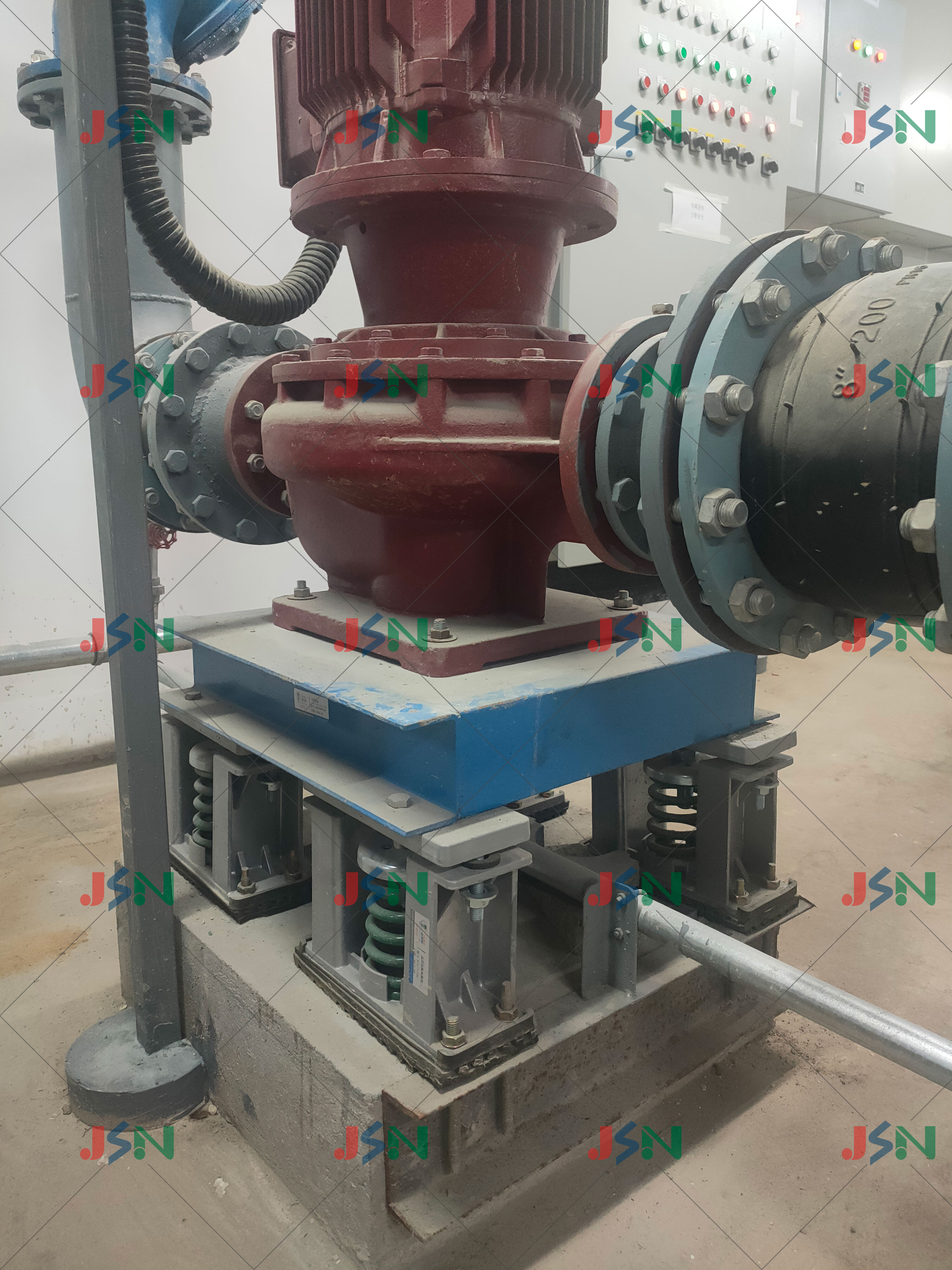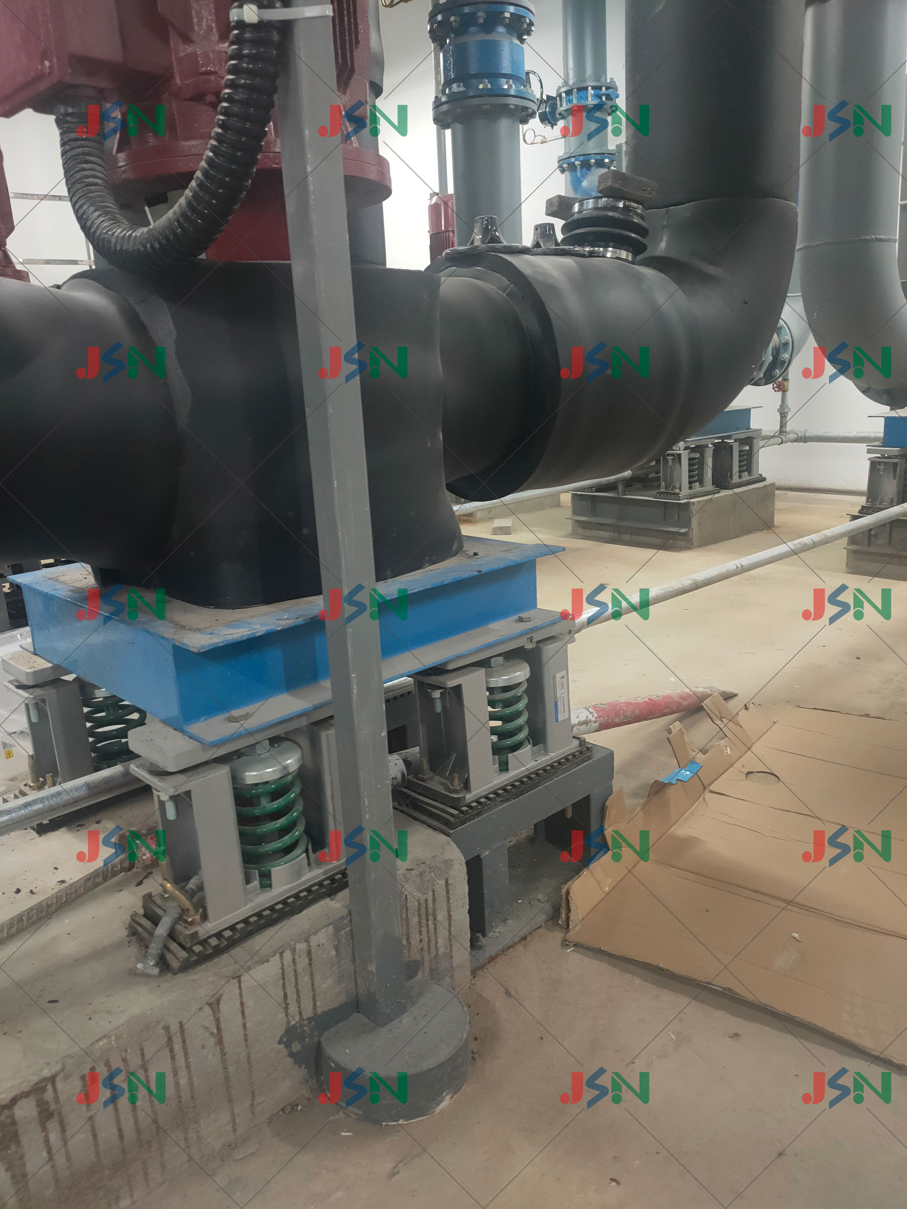 水泵配套金諾混合型減震臺座及JAD型撓度50mm可調式鋁合金減振器,水泵及管道之間安裝了XGD1型可曲撓單球體橡膠軟接頭,主機也是選用JAD型大撓度可調式彈簧減振器,目前在技術人員的指導下,產品已經全部安裝完畢,減震效果極佳,得到了業(yè)主和施工單位的一致好評。